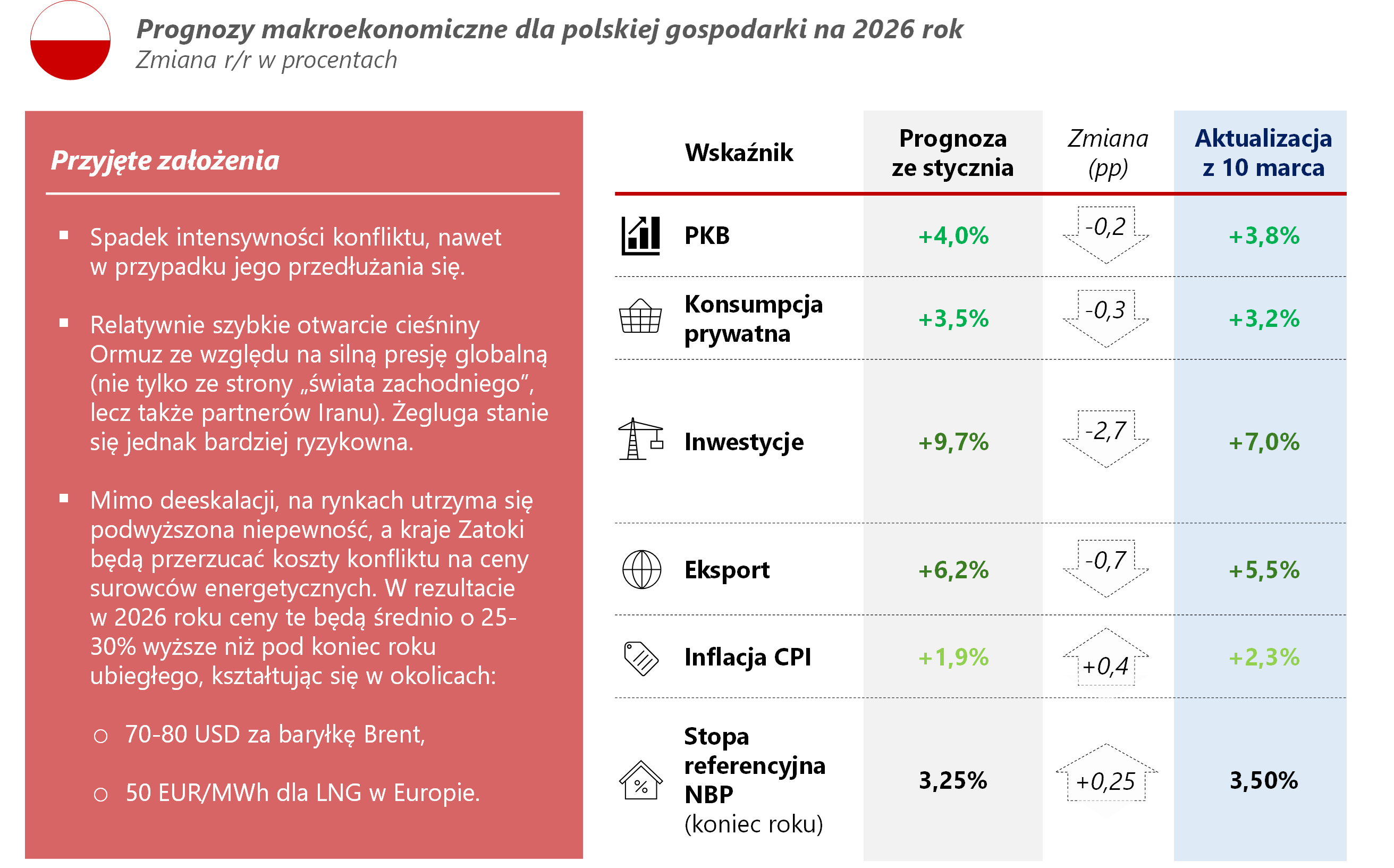 Wybuch wojny Izraela i USA z Iranem już teraz stał się impulsem do korekty prognoz makroekonomicznych. Obniżeniu uległy przewidywania dotyczące wzrostu gospodarczego, konsumpcji czy inwestycji. Kluczowe czynniki tej rewizji to wyższe ceny paliw i energii, opóźnienie cyklu obniżek stóp procentowych oraz słabszy popyt krajowy i zagraniczny.