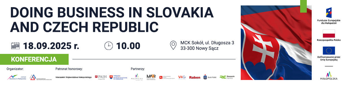 Zapraszamy na bezpłatne spotkanie informacyjne „Doing Business in Slovakia and Czech Republic”, które odbędzie się 18 września 2025 r. w Nowym Sączu. Wydarzenie, skierowane jest do małopolskich firm z sektora MŚP. To doskonała okazja, aby zdobyć praktyczną wiedzę, która otworzy nowe rynki dla Twojej firmy.